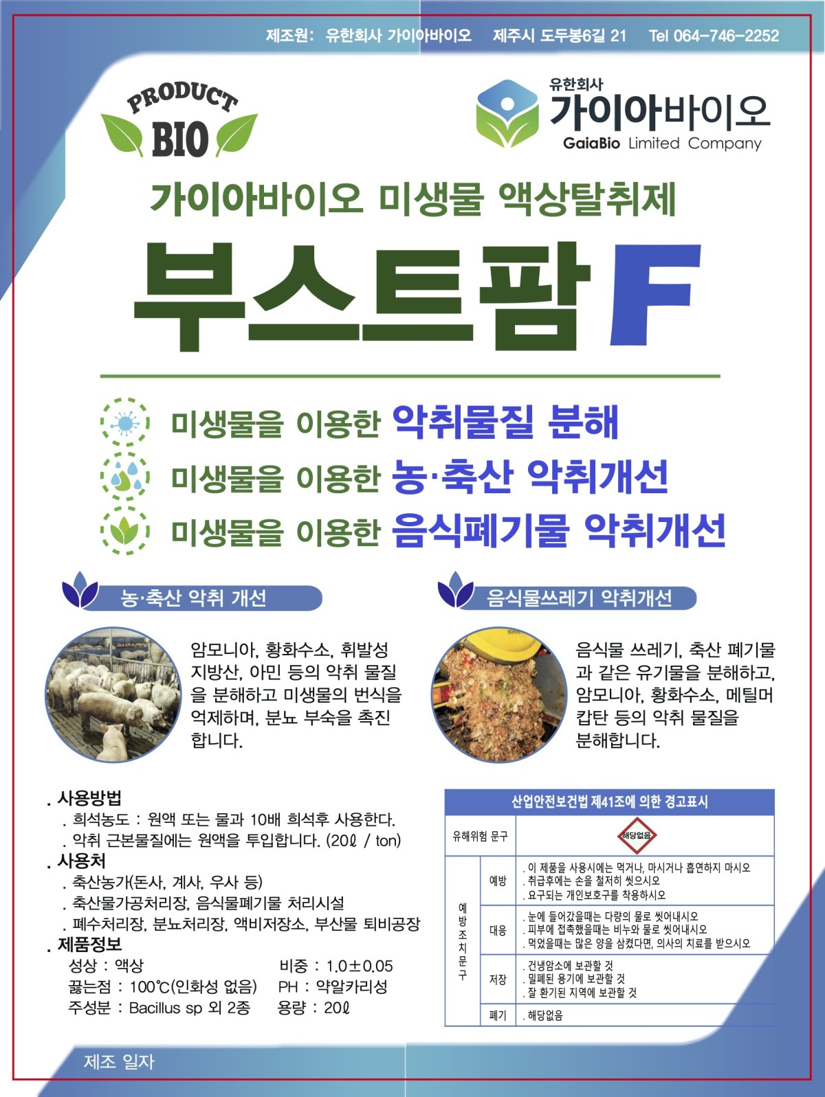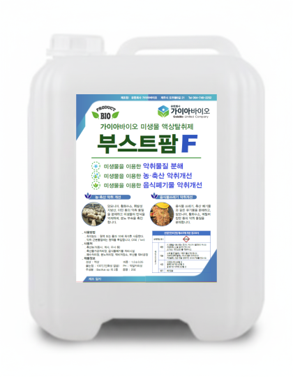 부스트팜 F 부스트팜 F 페이지 정보 작성자 가이아바이오 댓글 0건 조회 67회 작성일 25-09-09 11:22 목록 답변 글쓰기 본문 구분 알카리∙산성∙복합 악취를 제거하는 미생물 액상탈취제 요약 미생물을 이용한 악취물질 분해 주요성분 바실러스미생물, 식물성추출물, 에센셜오일 등 사용방법 . 상황에 따라 물 10~50배 희석 후 분무 또는 살포 . 악취 근원 물질에는 원액을 투입 (20ℓ/ton) 기대효과 . 암모니아, 황화수소, 메틸머캅탄 등 악취물질 분해 . 축산 분뇨처리장, 액비저장소 등 악취 저감 . 축산물가공처리장, 하수∙폐기물처리시설 등 악취 저감 용량 20L 제품설명 첨부파일 부스트팜V베지터블 스티커 Rev1.pdf (170.3K) 0회 다운로드 | DATE : 2025-10-12 15:37:36 이전글부스트팜 D 25.09.09 회원로그인 회원가입 로그인 회사소개 인사말 연혁 인증 오시는길 제품소개 토양개선 악취제거 미생물이야기 미생물 이야기 기후대응 악취대응 영농사례 만감류 재배 키위 재배 고객센터 공지사항 고객의 소리 Contact Us Tel.064-746-2552 평일 09:00 - 18:00 (주말/공휴일 휴무) 카카오톡 트위터 유투브 페이스북 인스타그램 회사소개 개인정보처리방침 상호명 :(유)가이아바이오 대표 : 하성해 주소 : 제주특별자치도 제주시 도두봉6길 21 E-mail : service@jejugaiabio.com 사업자등록번호 : 205-88-01728 Copyright © GaiaBio All rights reserved. Contact Us 064-746-2252 평일 09:00 - 18:00(주말/공휴일 휴무) 상단으로