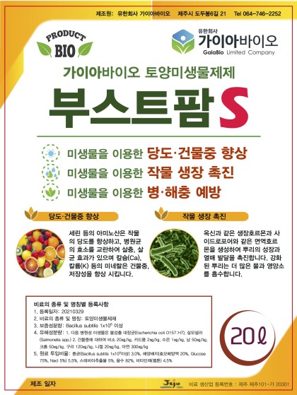 부스트팜 S 부스트팜 S 페이지 정보 작성자 가이아바이오 댓글 0건 조회 56회 작성일 25-09-09 11:43 목록 답변 글쓰기 본문 구분 토양∙당도 개선 요약 당도 및 토양환경 개선을 위한 고농도 미생물제제 주요성분 바실러스 미생물, 천연효소, 발효당 등 시비방법 50말 희석 500~700평 관주 기대효과 옥신, 사이드로포어 등의 고농도 대사물질 함유 . 미생물의 유기물 분해를 통한 토양 환경 개선 . 천연효소, 식물추출물 작용에 의한 당도 향상 . 과실 비대 및 열매 발달 촉진 용량 20L 제품설명 첨부파일 부스트팜S스위트 스티커 Rev1.pdf (486.0K) 0회 다운로드 | DATE : 2025-10-12 15:22:15 이전글부스트팜 V(500ml) 25.09.22 다음글부스트팜 S(500ml) 25.09.09 회원로그인 회원가입 로그인 회사소개 인사말 연혁 인증 오시는길 제품소개 토양개선 악취제거 미생물이야기 미생물 이야기 기후대응 악취대응 영농사례 만감류 재배 키위 재배 고객센터 공지사항 고객의 소리 Contact Us Tel.064-746-2552 평일 09:00 - 18:00 (주말/공휴일 휴무) 카카오톡 트위터 유투브 페이스북 인스타그램 회사소개 개인정보처리방침 상호명 :(유)가이아바이오 대표 : 하성해 주소 : 제주특별자치도 제주시 도두봉6길 21 E-mail : service@jejugaiabio.com 사업자등록번호 : 205-88-01728 Copyright © GaiaBio All rights reserved. Contact Us 064-746-2252 평일 09:00 - 18:00(주말/공휴일 휴무) 상단으로
