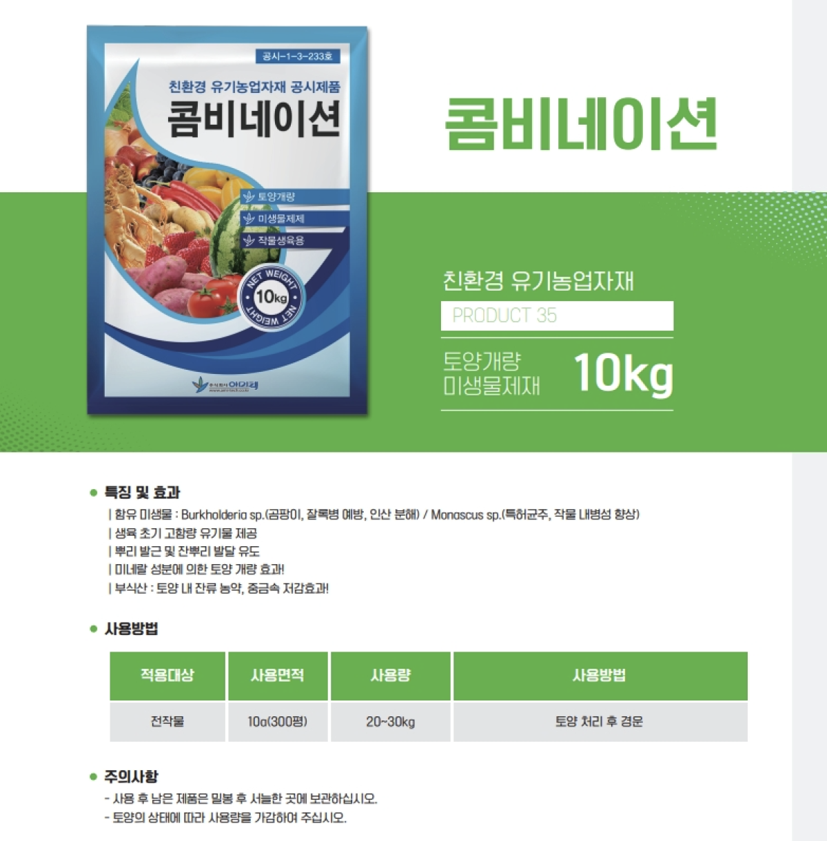 . 토양살포 : 300~400평 . 정식전 : 퇴비와 혼용 살포(400평) . 생육기 : 작물주변 토양 살포(300평) |