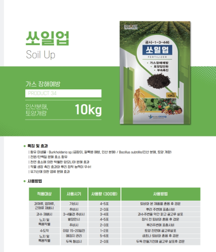 . 고농도 길항균 공급 효과로 토양 병해충 억재 . 불용성분 무기화로 뿌리 흡수율 증진 . 유기물 분해 및 토양물리성 개선 |