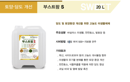 부스트팜 S 토양∙당도개선 부스트팜 S 페이지 정보 작성자 가이아바이오 댓글 0건 조회 72회 작성일 25-09-09 11:43 목록 답변 글쓰기 본문 구분 토양∙당도 개선 요약 당도 및 토양환경 개선을 위한 고농도 미생물제제 주요성분 바실러스 미생물, 천연효소, 발효당 등 기대효과 . 옥신, 사이드로포어 등의 고농도 대사물질 함유 . 미생물의 유기물 분해를 통한 토양 환경 개선 . 천연효소, 식물추출물 작용에 의한 당도 향상 . 과실 비대 및 열매 발달 촉진 시비방법 50말 희석 500~700평 관주 용량 20L 제품설명 이전글부스트팜 V(500ml) 25.09.22 다음글부스트팜 S(500ml) 25.09.09 회원로그인 회원가입 로그인 회사소개 인사말 연혁 인증 오시는길 제품소개 토양개선 악취제거 미생물이야기 미생물 하는일 기후대응 악취대응 영농사례 만감류 재배 키위 재배 고객센터 공지사항 고객의 소리 Contact Us Tel.064-746-2552 평일 09:00 - 18:00 (주말/공휴일 휴무) 카카오톡 트위터 유투브 페이스북 인스타그램 회사소개 개인정보처리방침 상호명 :(유)가이아바이오 대표 : 하성해 주소 : 제주특별자치도 제주시 도두봉6길 21 E-mail : service@jejugaiabio.com 사업자등록번호 : 205-88-01728 Copyright © GaiaBio All rights reserved. Contact Us 064-746-2252 평일 09:00 - 18:00(주말/공휴일 휴무) 상단으로
